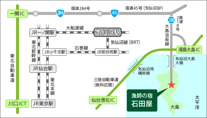 ・東北自動車道「一関IC」~国道284号線~(松川IC)~国道45号線(気仙沼バイパス)経由で約60㎞(所要およそ90分)で気仙沼大島へ。